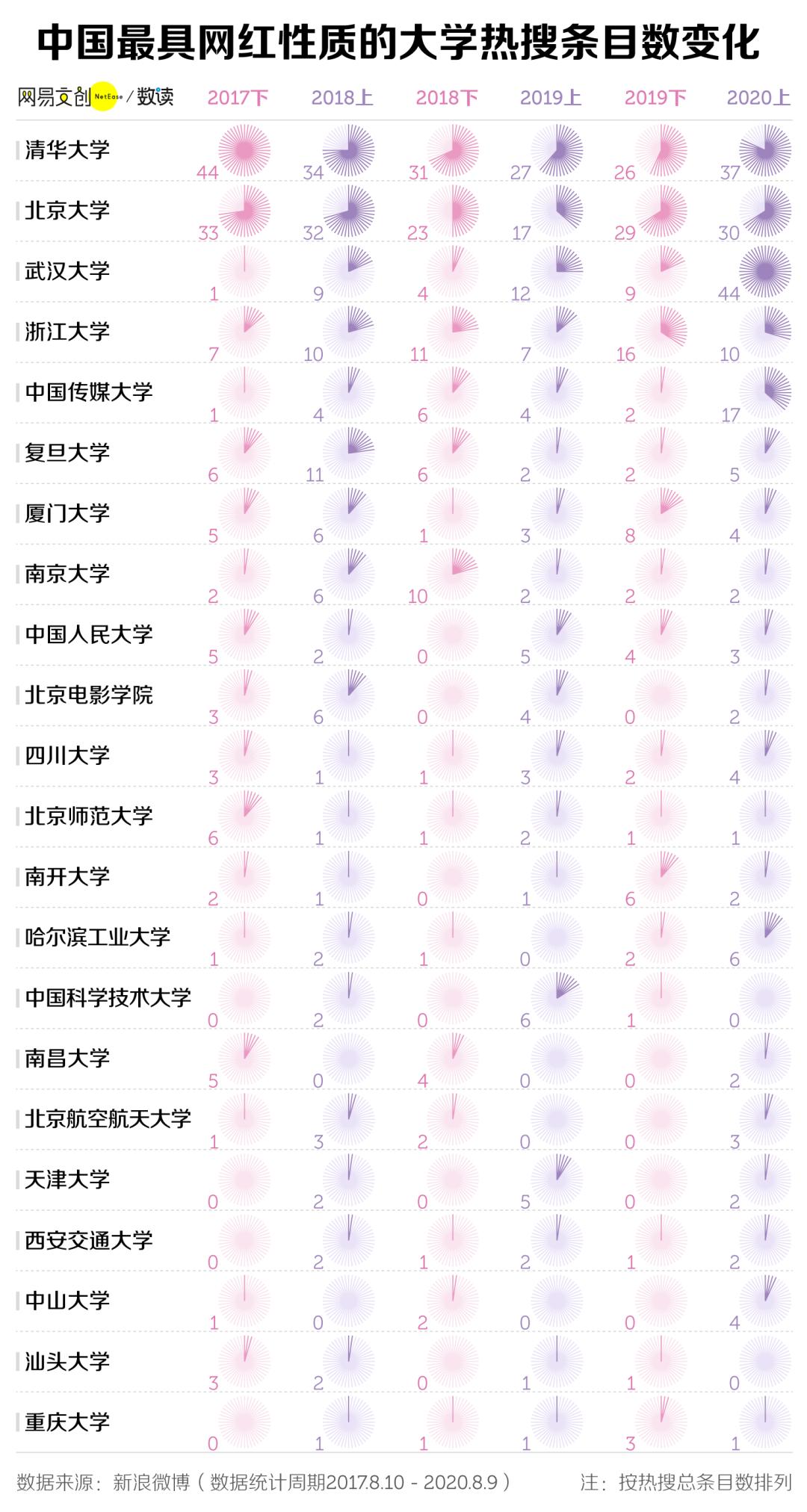 哈工大则凭借百年校庆火了一把,在 2020 年上半年有 6 条热搜,占总热搜条目数量的一半。