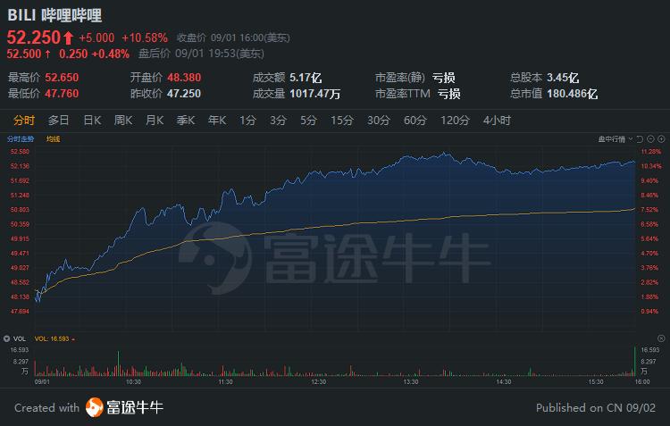 哔哩哔哩大涨10.58%,股价创新高