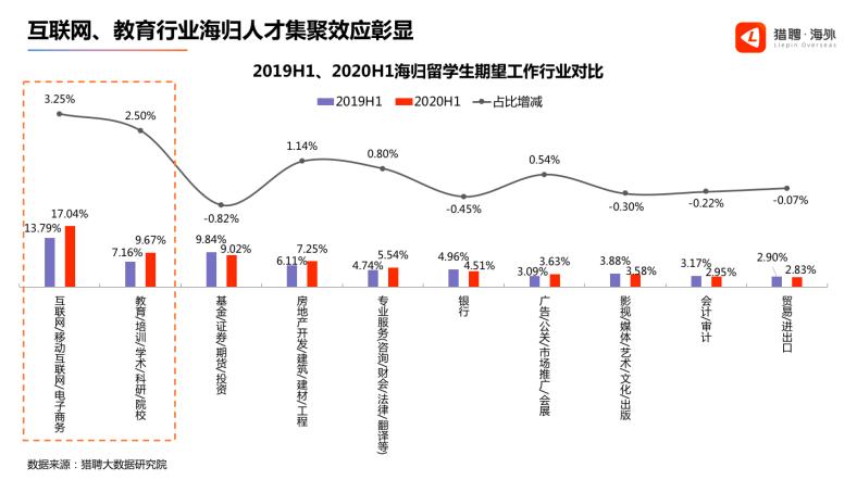 在海归留学生期望工作行业对比中,互联网/移动互联网/电子商务、教育/培训/学术/科研/院校、以及基金/证券/期货/投资、房地产开发/建筑/建材/工程几个行业人才集聚效应明显,相比去年同期均有提升。