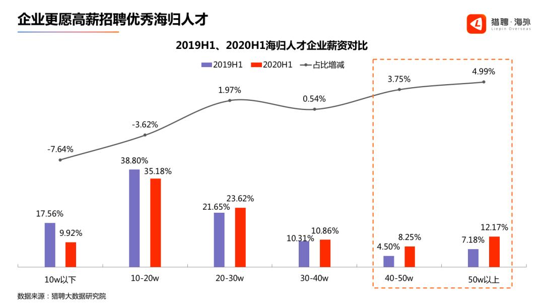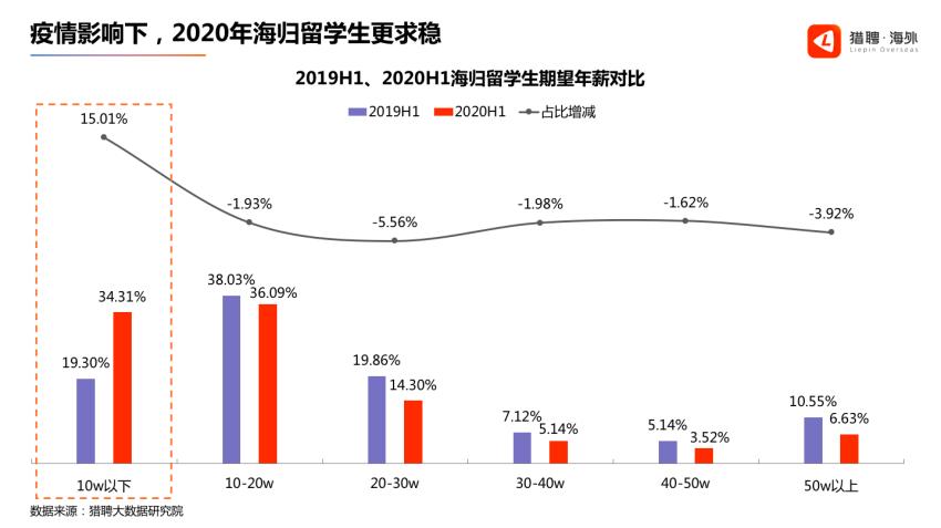 根据《2020海归人才求职趋势报告》调研显示,海归硕士应届生的平均期望薪资仅略高于国内硕士学历人才,而海归本科应届生的期望薪资较国内本科应届生高出44%,但在求职市场中,对于非国际一流高校的本科海归应届生,雇主在整体上并未展现出特别偏好。
