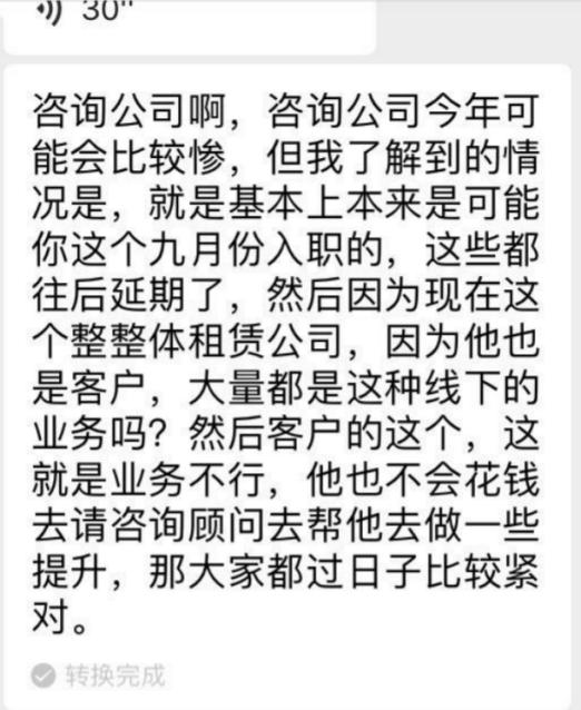 甲方暂停项目、或者缩减原本留出的项目预算,这些都会导致咨询公司推迟新人入职、甚至缩减招聘。