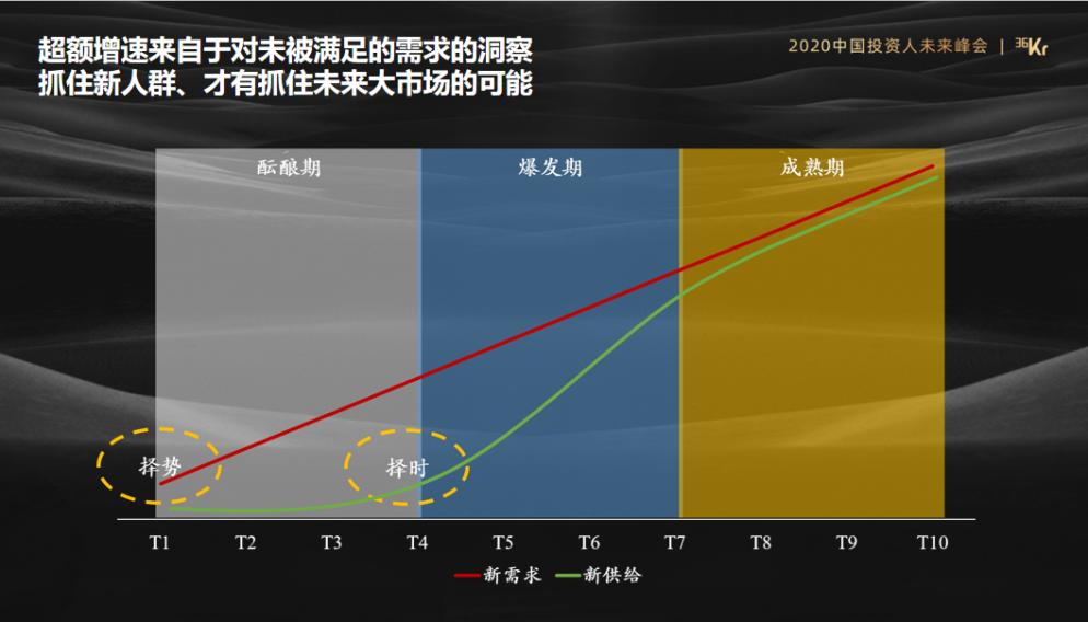 我们将新需求的积累和创业公司的发展分为酝酿期、爆发期、成熟期。红色线条代表“新需求”的不断累积,即“择势”;绿色线条代表“新供给”的出现和变化,即“择时”。在酝酿期并没有给创业公司机会,即使是今天会场所有的人都愿意此时此刻付溢价去买南极的某种鱼,这时需求的密度不足以持续养活创业公司,我们想等的是“杯子要倒下来”的时候。