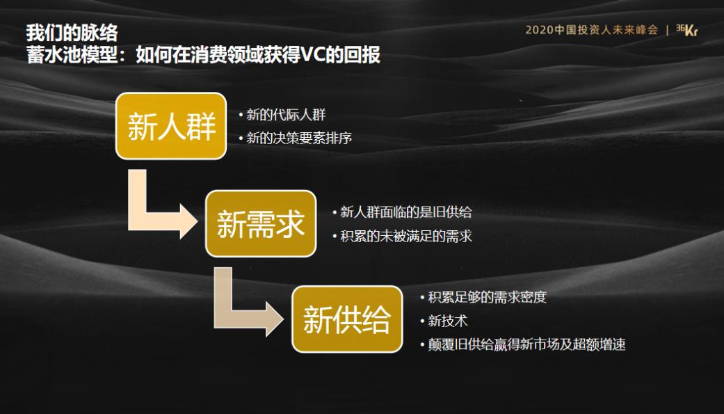 关于如何在消费领域获得VC的回报,我们梳理了一个模型——蓄水池模型。它的三个关键要素:新人群、新消费、新供给。这些词大家一定听过很多遍了,在这里简单分享一下我们的思考。