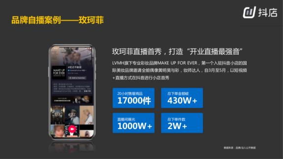 比如说玫珂菲在第一场直播中,20小时售謦了17000件商品,总下单金额突破了430万,直播间的曝光突破了1000万,总下单件数突破了2万件,打造了“开业直播最强音”。