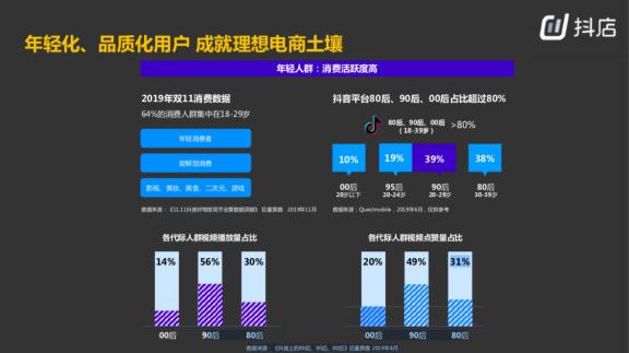 首先,抖音上的用户非常年轻化、品质化,整体活跃度非常高。2019年双11消费数据显示,64%的消费人群集中在18岁-29岁,这部分用户人群相对来讲很年轻,是尝鲜型的人群,他们喜欢影视、美妆、美食、二次元、游戏等。