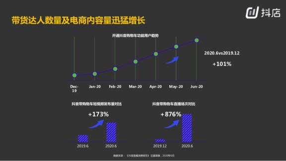 最新数据显示,从2019年12月到2020年6月,开通抖音购物车功能的用户增长101%。带货功能用户的增加带动了整体带货内容的产出。这个内容产出有两种类型: