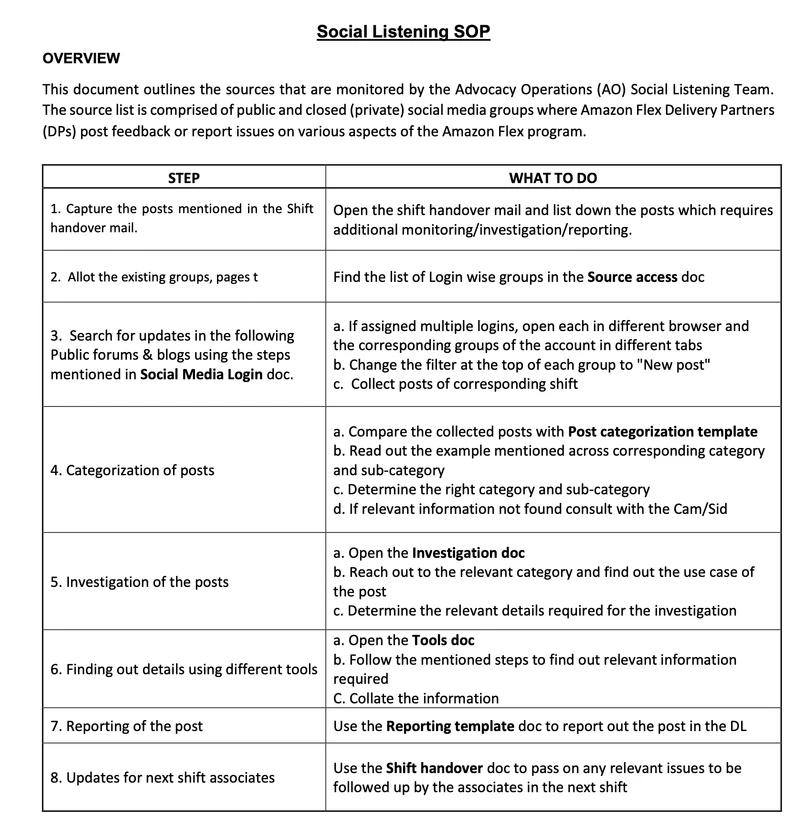 该监控团队名为“Advocacy Operations Social Listening Team”,成员们负责“捕捉”司机们(在文档中被称为“配送伙伴”或“DP”)发表的帖子,对其进行分类、调查(标记)并添加至报告当中。