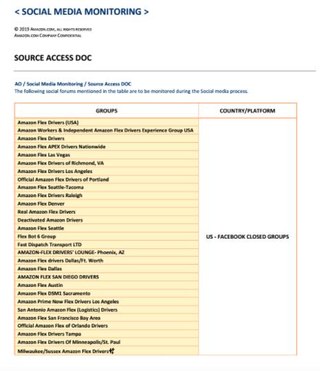 有一个名为“social media monitoring”,即社交媒体监控的文档,其中列出了全球范围内已被关闭的 Amazon Flex Driver Facebook 群组与网站、司机们在 Reddit 子版块中的发言以及 Twitter 关键字“Amazon Flex”。受到监控的包括“洛杉矶 Amazon Flex 司机”、“Amazon Flex 司机”、“亚马逊离职司机群”等数十个 Facebook 群组。
