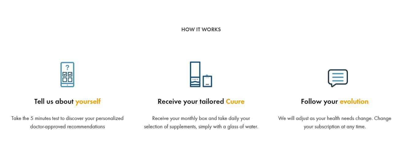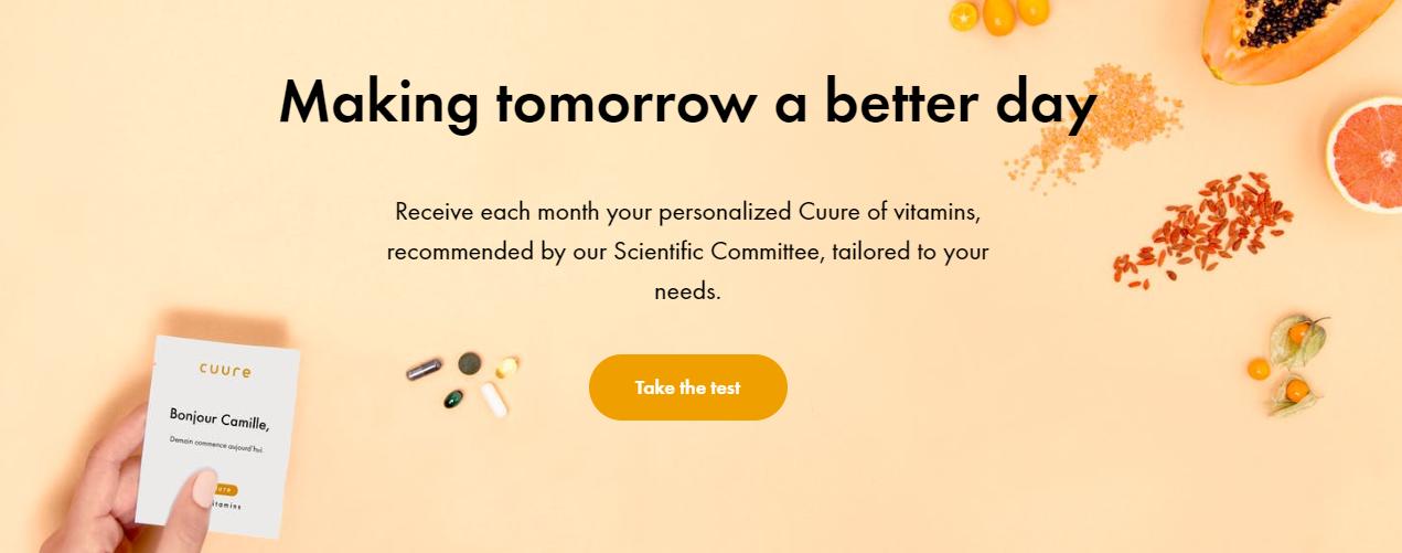 2019 年 1 月,总部位于法国巴黎的「Cuure」,由 Hugo Facchin 和 Jules Marcilhacy 成立。该公司为消费者们提供了,按月订阅的个性化食品补充剂。现如今,人们很重视个人健康和免疫能力,而且个性化医疗保健正变得越来越普遍。