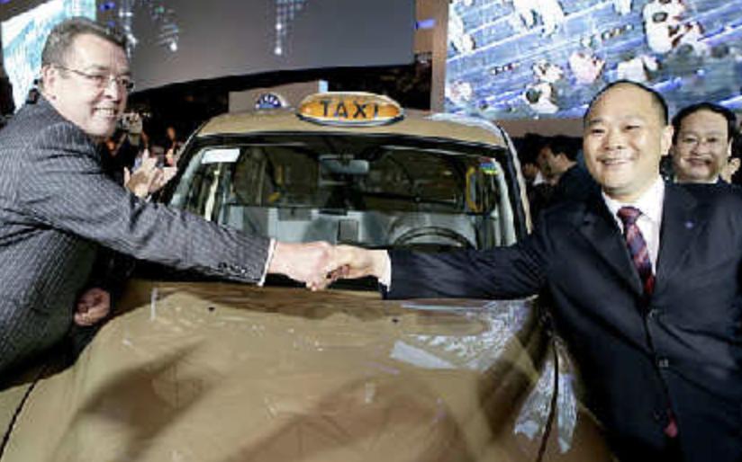 李书福(右)与英国锰铜控股公司CEO汤姆在英国TX4经典出租车中国上市仪式上握手留念