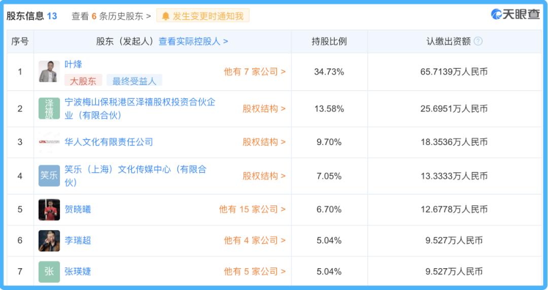 笑果文化部分股东持股情况(图片来源:天眼查)