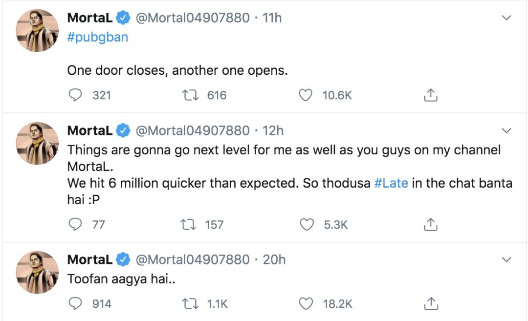 印度著名的PUBG玩家MortaL(本名Naman Mathur),在YouTube上拥有超600万粉丝,在9月2日印度政府禁令宣布几分钟后,他就在Twitter写下了对禁令的感受:“Toofan aagya hai(暴风雨来了)”。几个小时后,他又写道:“一扇门关上了,另一扇门会打开。”