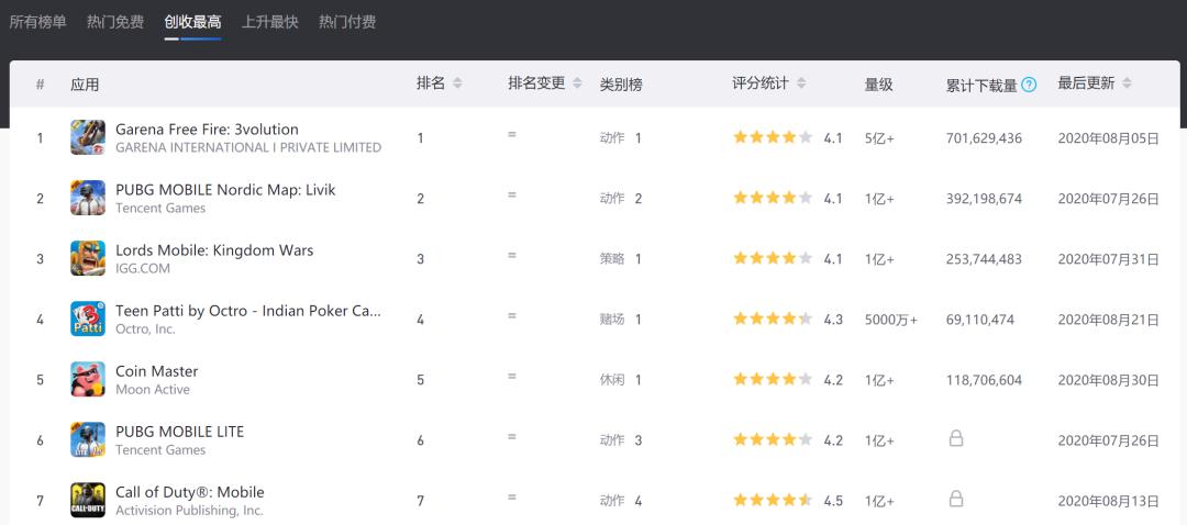 Google Play印度商店应用创收数据,统计时间:2020年9月30日/Evasso
