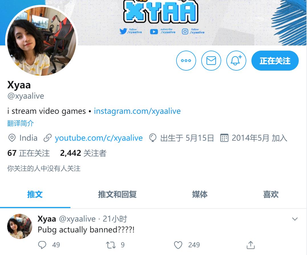 9月2日晚上,听到PUBG Mobile被禁的消息之后,她在推特上发出了巨大的疑问 “PUBG真的被禁了吗??? !” 。随后的直播中,她把主题设定为“PUBG Ban? :O”,和粉丝们聊了这件事情:“我真的很震惊,我感觉很沮丧,这件事太奇怪了,” XYAA说道。她自己同时玩多款游戏,但如今担心一些依赖PUBG的主播会受很大影响。