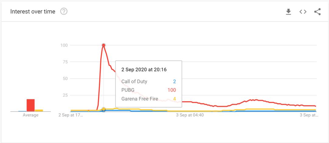 这一禁令震惊了整个PUBG印度社区的玩家。谷歌趋势显示,在禁令发布的北京时间20:06(印度时间17:36),印度地区对"PUBG"的搜索指数一路狂飙,10分钟内就达到了100点的高峰。