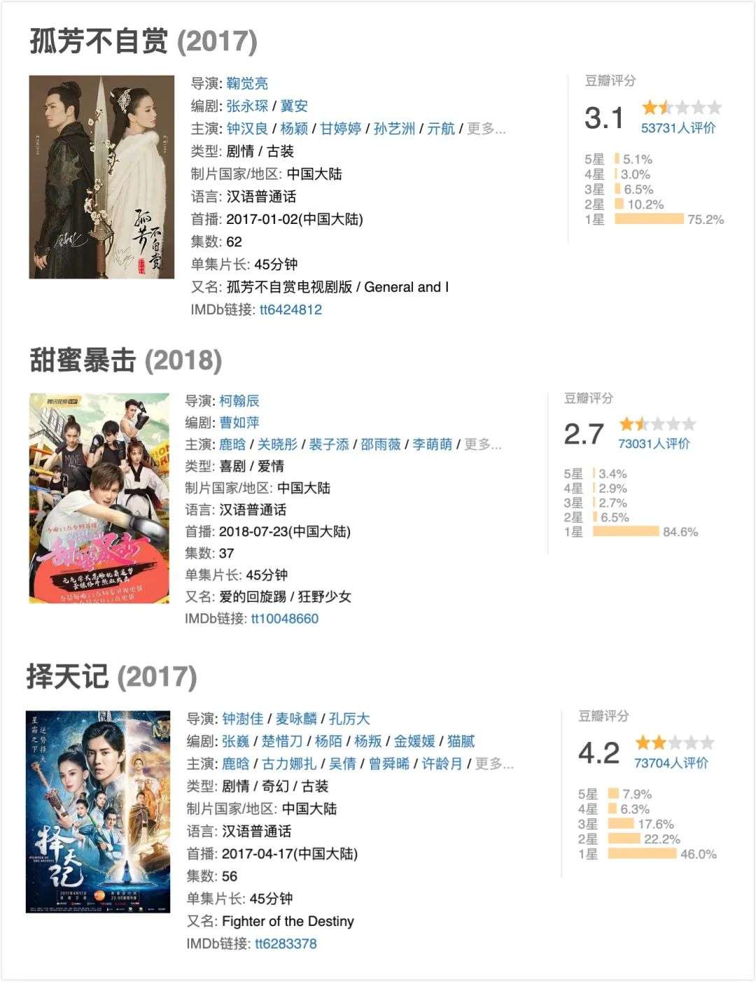 三是头部影视公司并非头部影视内容的绝对保险,例如高喊做“超级IP剧”的华策影视在2017年拿出的开年大戏《孤芳不自赏》口碑扑街,《甜蜜暴击》收视口碑双惨淡,柠萌影业和腾讯影业共同出品的《择天记》在湖南卫视收视率也只徘徊在1%左右。