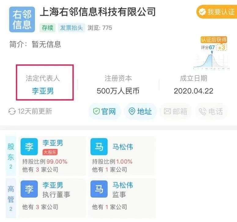 两家公司在同一幢楼办公,天眼查信息显示,上海右邻信息科技有限公司的法人和实际控制人是李亚男。