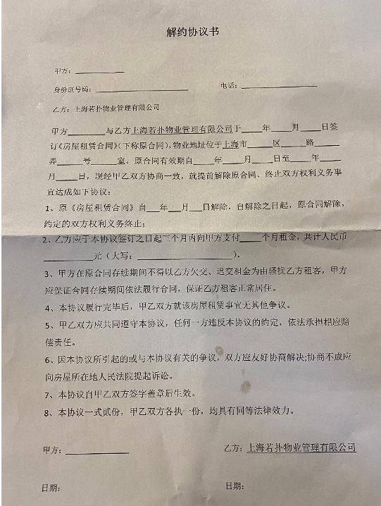 若扑只给房东一个解决方案,签了解约协议书,三个月后可以拿到拖欠的房租。