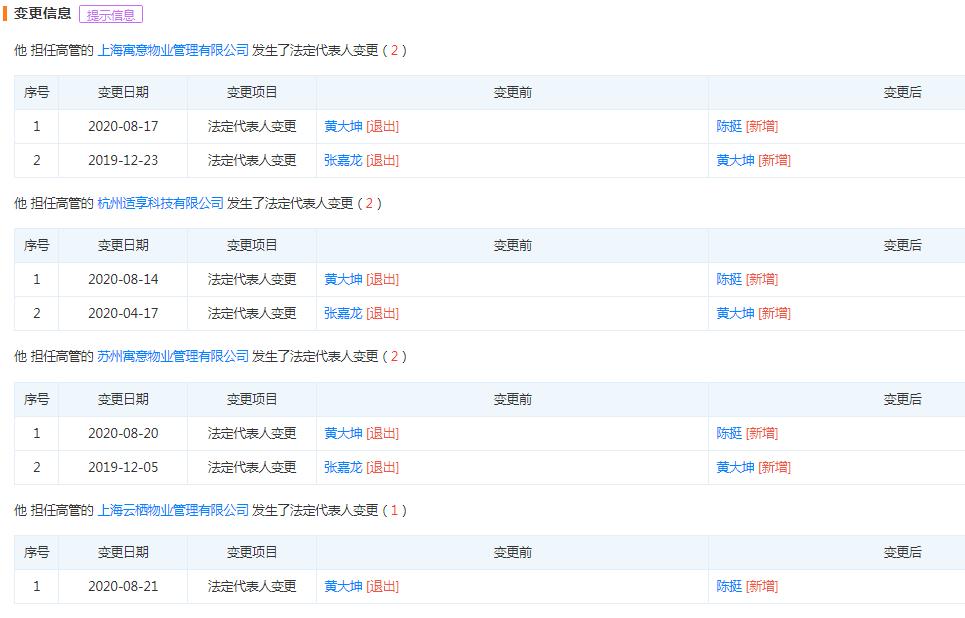 跟若扑类似的操作是,上海寓意物业管理有限公司旗下8家公司的实际控制人为黄大坤,但从今年8月17日起,黄大坤陆续从多家公司的法定代表人和执行董事兼总经理席位上退出。