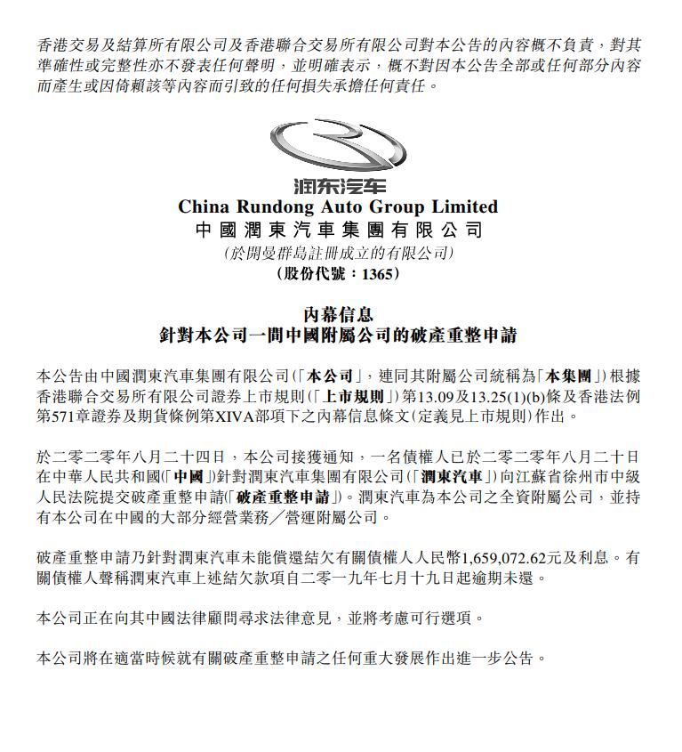 8月24日,润东汽车发布公告称,一名债权人已于2020年8月20日针对润东汽车集团有限公司向江苏省徐州市中级人民法院提交破产重整申请。根据公告,债权人声称润东汽车集团结欠有关债权人165.9万元及利息,该结欠款项自2019年7月19日起逾期未还,因此,提出破产重整申请。