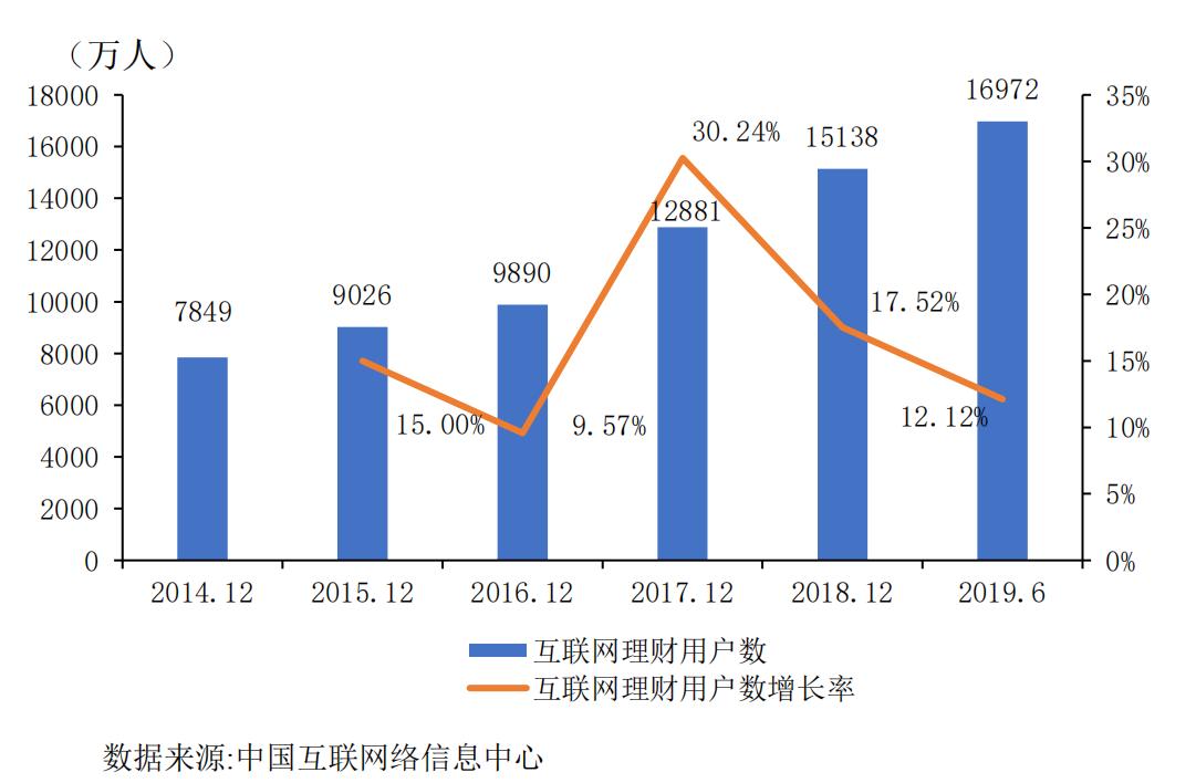 图 1-1 2014 年-2019 年中国互联网理财用户数及增长率