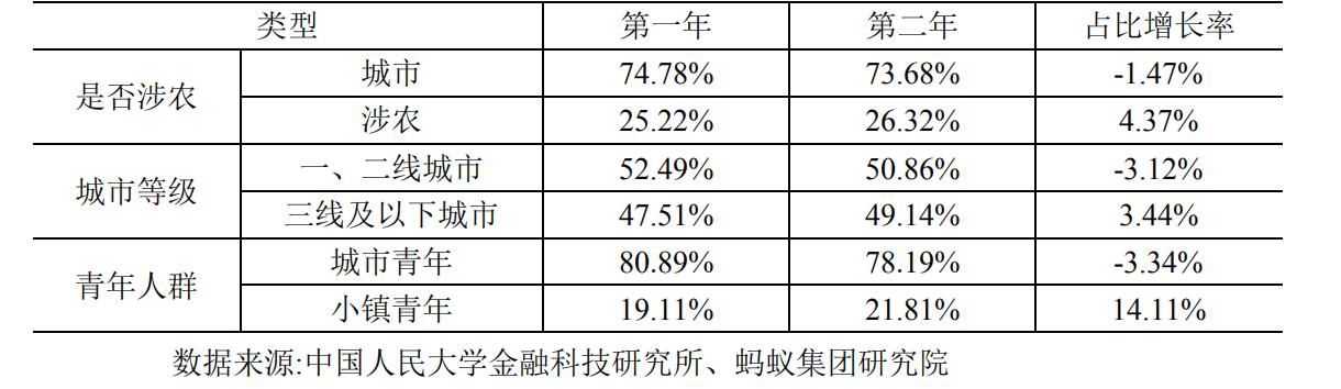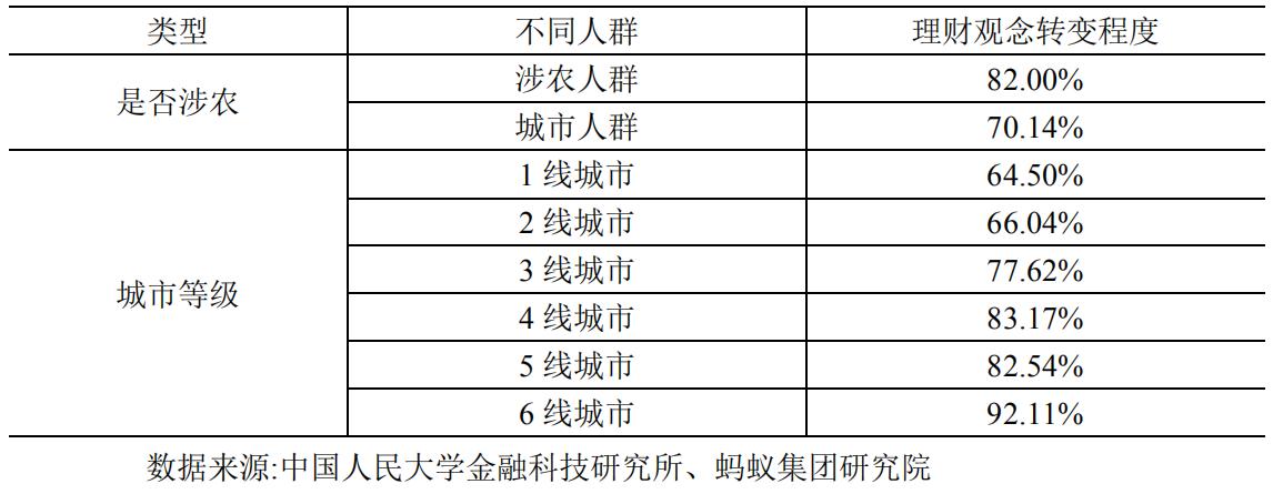《理财报告》显示,活跃理财用户中下沉人群占比显著增加,涉农人群中有过理财行为的人数占比高于城市人群(表1-1)。
