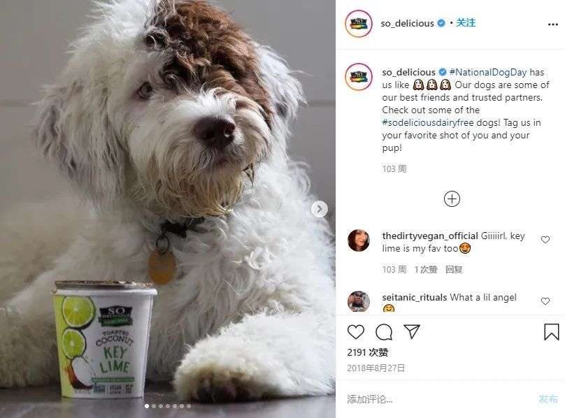 甚至对爱宠人士,他们也有一套独特的打法。在官方Ins上晒出产品与宠物的合照,告诉消费者,这是宠物也能喝的酸奶。既强化了人们心中对So Delicious 酸奶健康的印象,又吸引了爱宠人士。