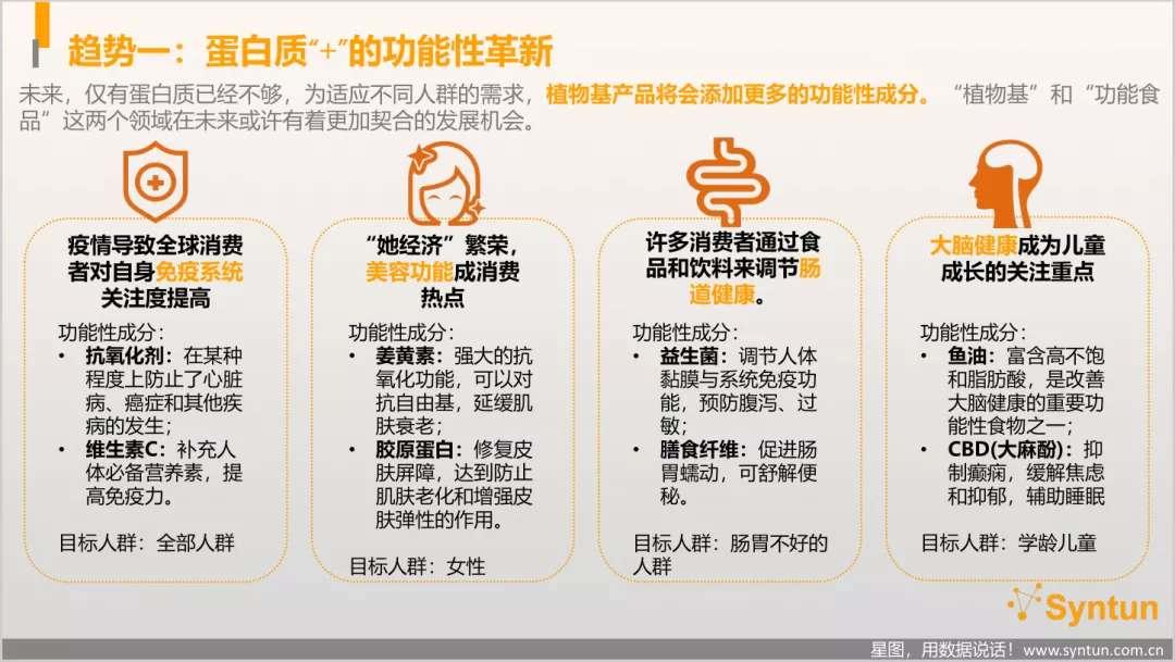 第二道风,蛋白质+的功能性革新。在《植物的力量:植物基趋势洞察报告》中,可以看到“蛋白质+ 的功能性革新”的身影。随着人们日渐增长的消费需求,仅有蛋白质已经不够,产品中的功能性成分逐渐成为影响消费者购买决策的重要标准之一。