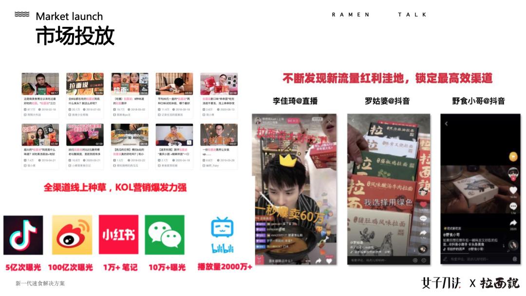 2018年,拉面说正式开始投放。在市场投放上,拉面说采用的打法是:锁定流量所在的社交媒体平台;策略是,做全渠道的线上种草,以及整体的KOL营销。
