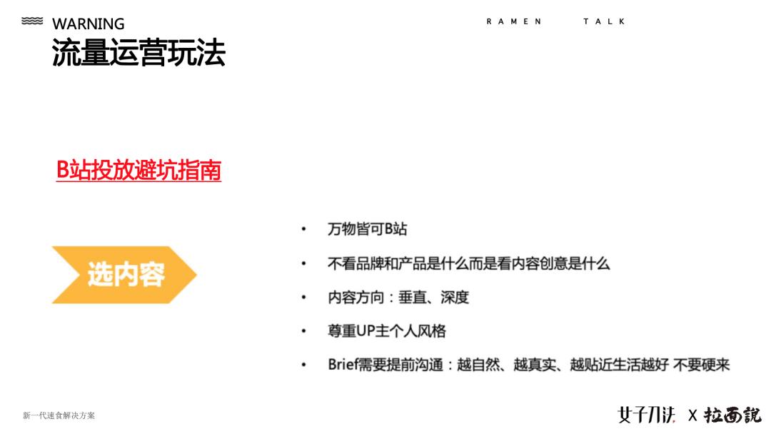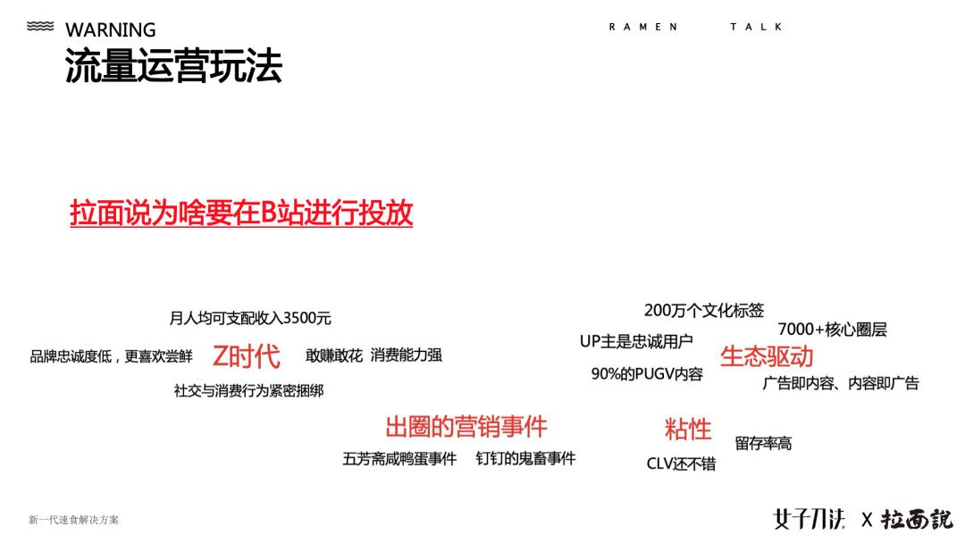 首先,B站最主要的人群是Z世代。Z世代是敢赚敢花、消费能力非常强的群体,然而同样,他们的品牌忠诚度往往比较低。所以拉面说在做用户拉新时,会着重考虑建立品牌和Z世代的关联度,以增加用户黏性。