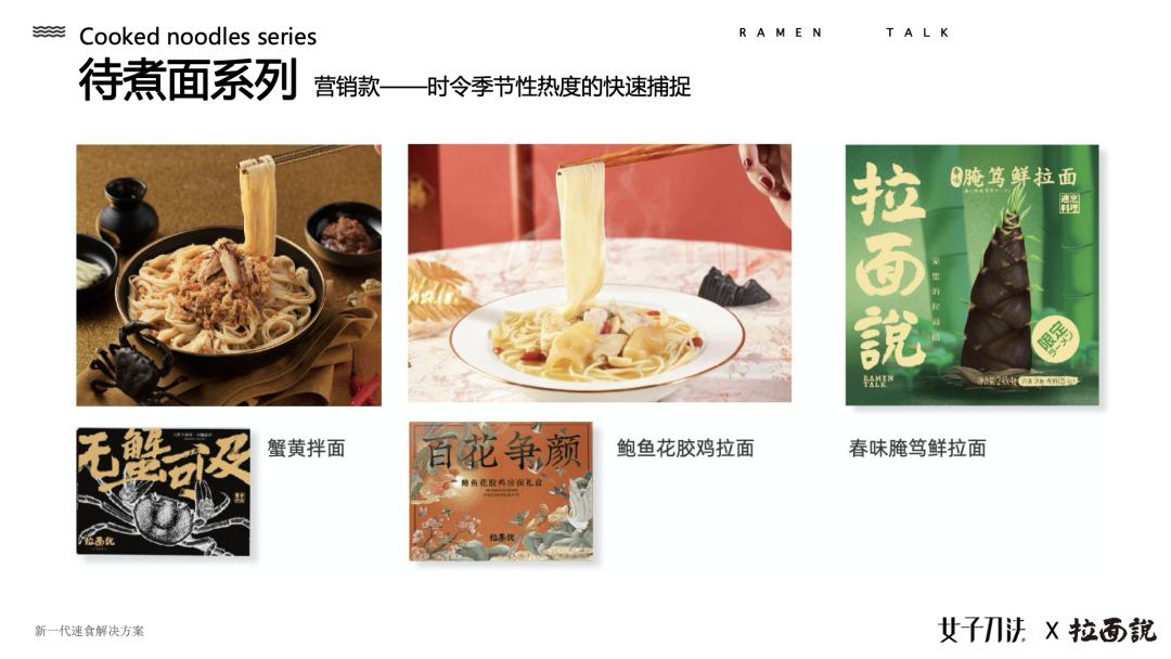第一块,最经典的待煮面系列。这是拉面说的品牌核心系列,在保留四款最经典口味的同时,不断探寻新的爆品口味。