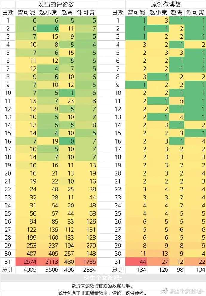 根据微博用户@生个女孩吧-统计,8月搬家的4位爱豆的自评数量逐渐递增,并在26日谢可寅自评126条之后,所有人第二天都自评到了三位数。