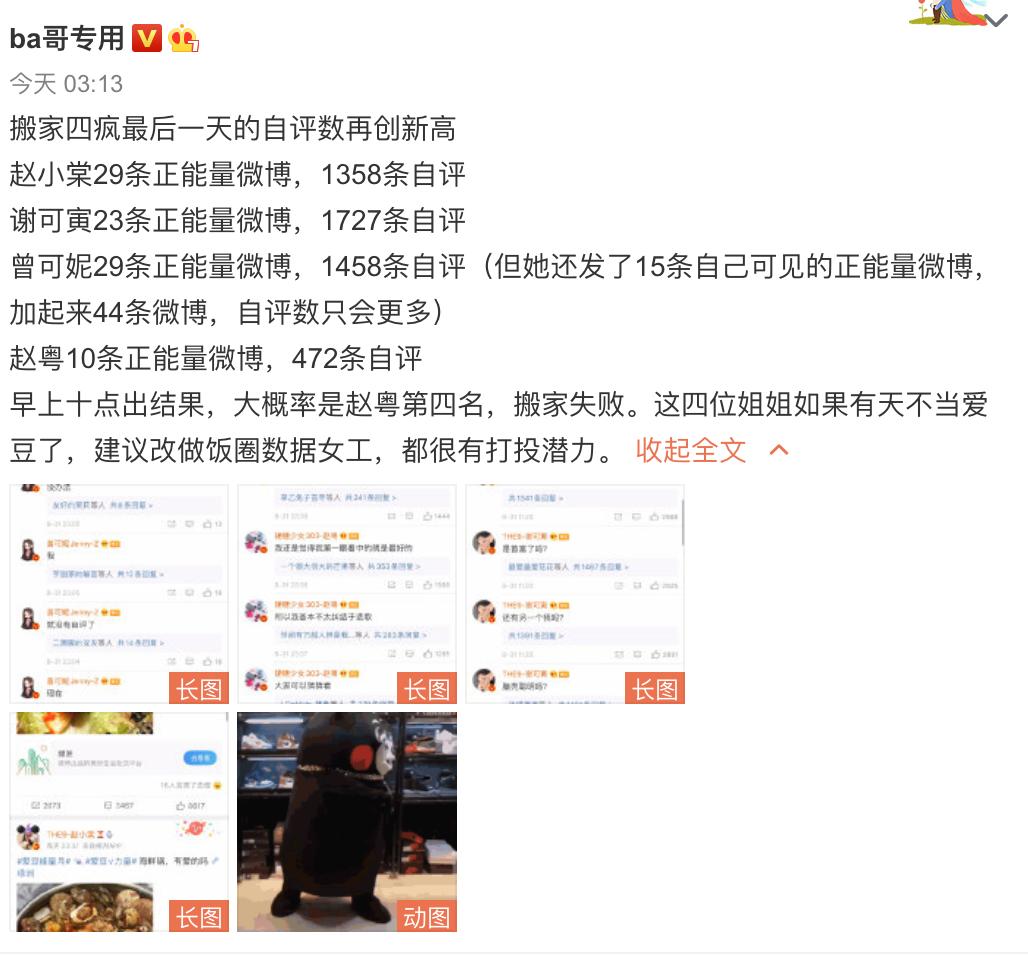 在搬家规则中,明星自己主动带正能量话题发布原创微博、评论自己的微博等,都会主动计入分数,为了给粉丝们减轻负担,被卷入其中的4位爱豆都化身数据女工,一同加入了搬家的战局。艺人直接“下场”自评上千条这种前所未有的参与程度,成为了这次搬家“载入史册”的原因。