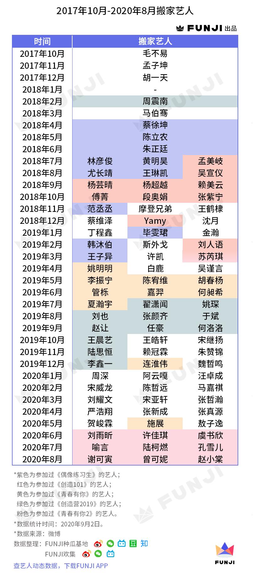 FUNJI统计的2017年10月-2020年8月搬家的艺人