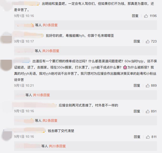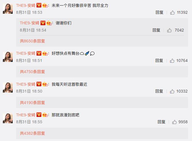在谢可寅们删除微博评论的同时,同为THE9成员的安崎已经兢兢业业地开启了9月的自评工作。8月31日的傍晚,她在自己的微博评论区留言:“未来一个月好像很辛苦,我尽全力。”而粉丝们喊着“你们真的忍心看她失望吗”,投入了新一轮做数据打投的浪潮之中。