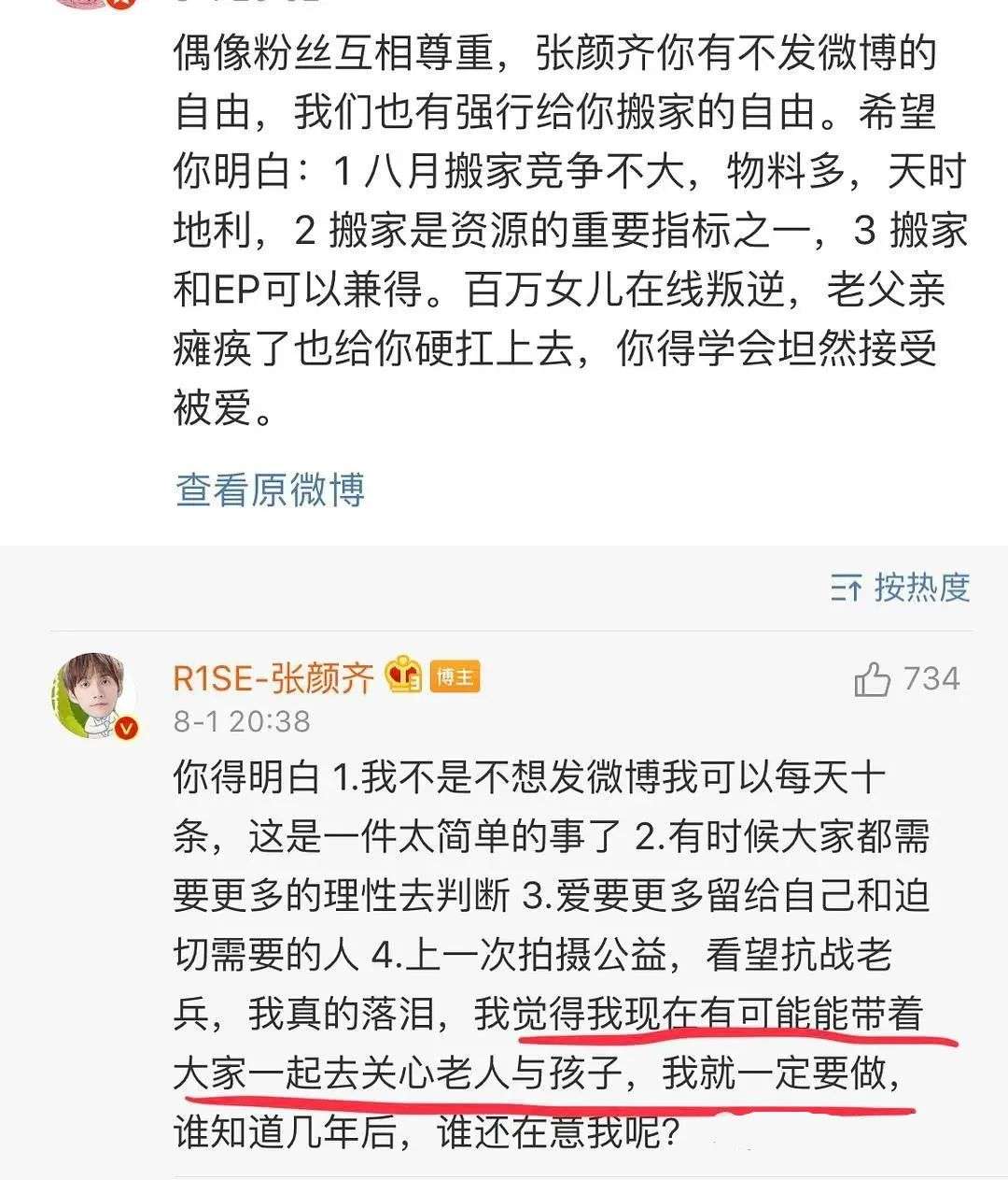 确实有爱豆曾经站出来反对过搬家:R1SE成员张颜齐在去年得知粉丝要为自己搬家时,直接在微博提出搬家这件事对他本人来说没有实际意义——“没有意义的事少做”。但微博发出后,有不少粉丝直言前期已经准备了整整一个月,“你配不配合家我们都要搬”。最终张颜齐表示如果粉丝一定要搬家,那么粉丝在搬家时花出多少钱,他就在公益平台捐出多少,才平息了这一场饭圈内部的舆论波动。