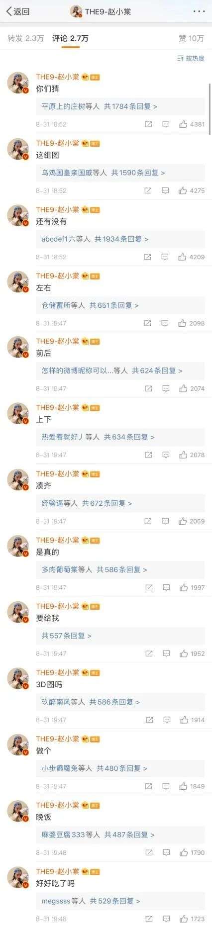 如果你点开THE9成员赵小棠在8月发出的微博,一定会震惊于评论里由赵小棠本人发出、拖动进度条却拖不到尽头的上百条评论。