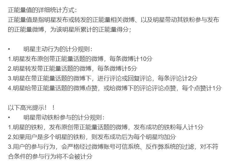 而无论粉丝是否甘之如饴,集资数额的节节攀升对于他们来说都无疑是种负担,那么剩下的最后一项指标,即正能量值,则成为了这次搬家中唯一能突破的一项。而根据明星势力榜改版后的规则显示,正能量值的增加需要明星的主动行为,即发布带有#元气爱豆的日常#等话题的微博并进行自评,可以多多加分。