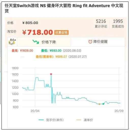 《健身环》自去年10月上市之后,售价不断走高。起初,它在市场上卖 700 元不等。后来在疫情期间,海外版本的行情价突然猛涨,直线逼近 2000 元大关。下半年以来,游戏价格开始走低,但仍在 800 元左右徘徊。
