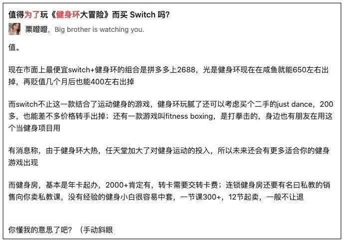 这是499元《健身环》所具备的市场意义。知乎上有道题,问的是「值得为了玩《健身环》而买 Switch 吗?」其中,获赞最高的回答是肯定。由此及彼地看,人们也有理由为了国行《健身环》而购买国行 Switch(毕竟499元的健身环仅支持国行机子)。
