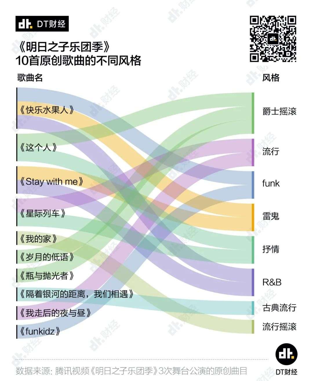 扒了下节目开播以来各个乐团演绎过的歌曲,从风格来看,这波年轻人确实不太唱民谣,也不是只爱摇滚,他们尝试过的风格有:雷鬼、R&B、funk、民乐、爵士、抒情、古典流行、说唱金属……