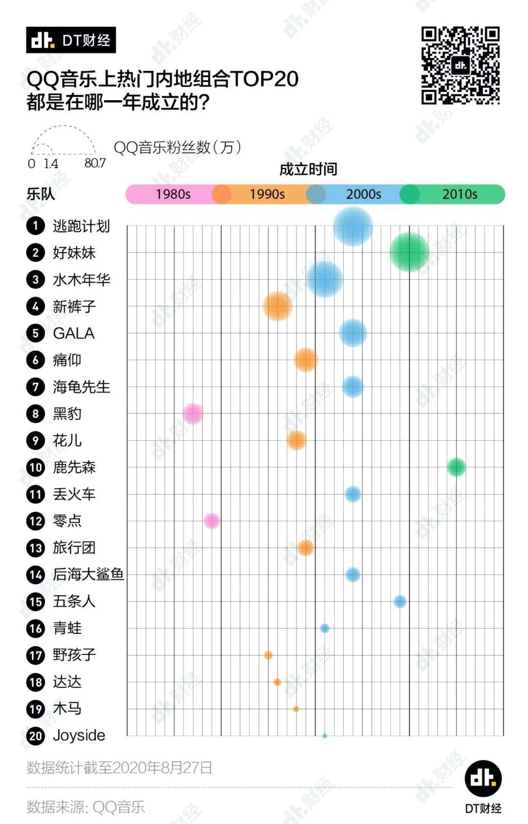 看了下大家的成立时间,我们发现,人气高的确实都是老乐队。这20支乐队平均成立时间为19.9年,其中有18支乐队成立于2010年之前。最年轻的鹿先森,也已经成立了5年。