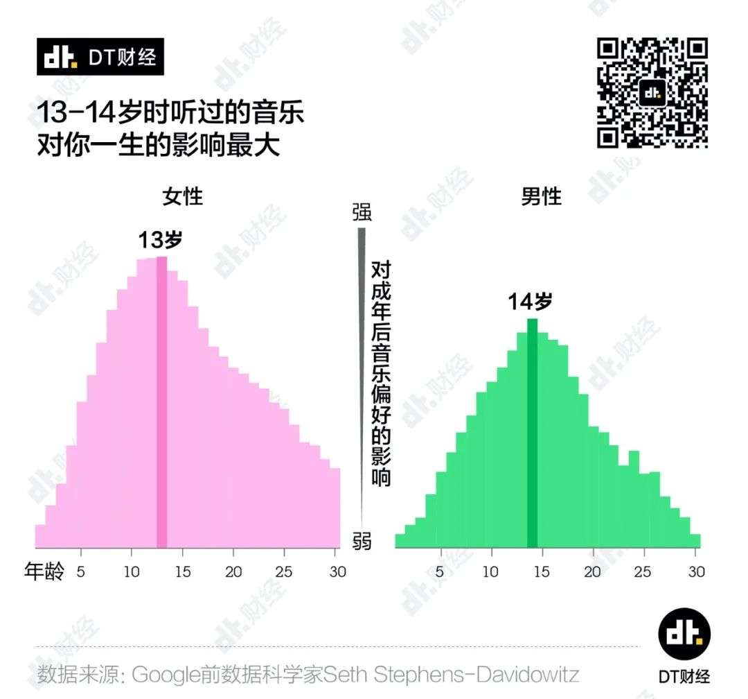 Google前数据科学家Seth Stephens-Davidowitz研究发现,一个人在13-14岁时听的歌,对其一生品位的影响是最大的。此时培养起的音乐习惯与爱好,影响大于人生其他任何阶段。