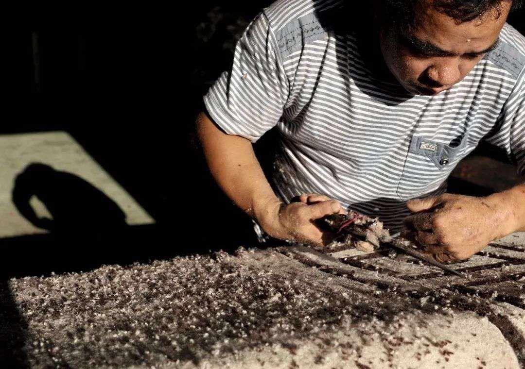 ▲地毯加工步骤之一:平活,可以让地毯变得平整。摄影:安舜