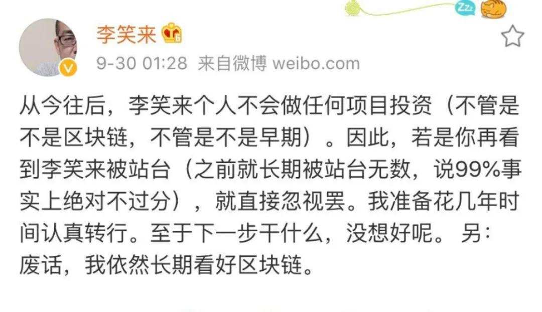 在2018年9月30日的凌晨1点半,李笑来发了这样一条微博:从今往后,李笑来个人不会做任何项目投资(不管是不是区块链,不管是不是早期)。因此,若是你再看到李笑来被站台(之前就长期被站台无数,说99%事实上绝对不过分),就直接忽视罢。我准备花几年时间认真转行。至于下一步干什么,没想好呢。