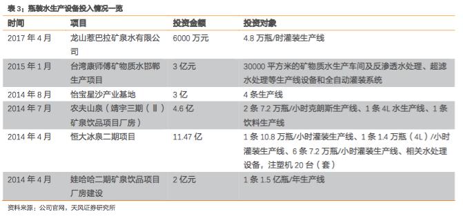 农夫山泉说过“我们不生产水,只是大自然的搬运工”。那想要“搬水”,就要建立生产线,对水进行过滤等基本处理和包装。瓶装水厂商一般需要配置过滤杀菌设备、包装设备等生产线。这些生产线设备初期投入规模较大,例如一套较为先进的德国克朗斯矿泉水生产线设备造价约8000 万元。