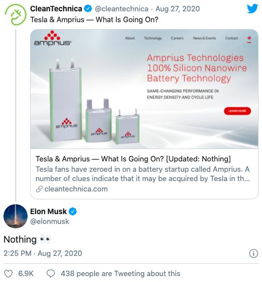 虽然之后马斯克在外媒cleantechnica的推文下面表示,特斯拉与Amprius没有关系,但这个回应却并不够坚决(emoji表情的使用让这个回答显的并不正式,当然不排除笔者过度解读的可能性)。至于这两家公司是否有联系还需要等到电池日活动当天马斯克亲自来揭示。