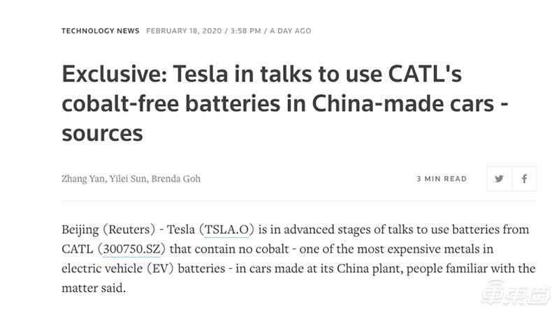 ▲路透社报道,特斯拉正在与宁德时代商议无钴电池合作