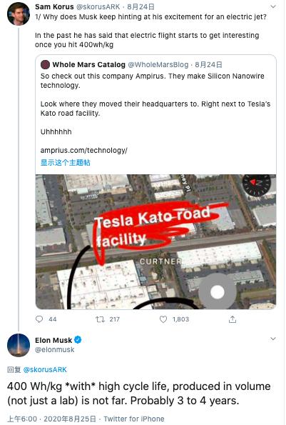 之后,有博主在推特上发推表示,Amprius硅纳米线电池在能量密度上非常有优势,马斯克则直接在这条推特下方回应称,400Wh/kg、具备高循环寿命,且可批量生产的电芯并不遥远,可能会在3到4年内实现。