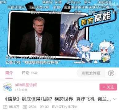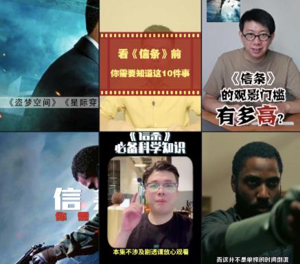整个9月,B站、抖音、西瓜视频等短视频平台的电影UP主针对《信条》产出观影指南便成为必修课。粗略统计,B站在《信条》映前就有超过1000条以上UP主原创视频,其中80%以上都是针对剧情结构预测分析,还包括物理、热力等知识普及内容。